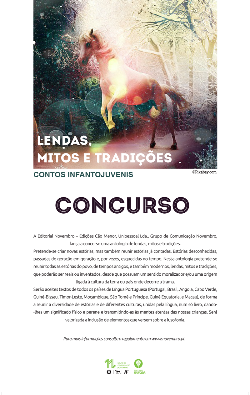 A Editorial Novembro lança a concurso duas antologias: Antologia de Contos Fantásticos e Antologia de Lendas, Mitos e Tradições. Dê largas à sua imaginação. Consulte o nosso regulamento.